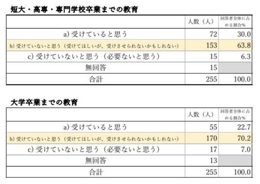 さらに教育についても、高校卒業までの教育は「受けている」が約 9 割、「受けてほしいが受けさせられないかも知れない」と答えたのは 1 割強に過ぎないがその一方で、高等教育となると極端に下がる。