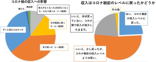 n=255、コロナ禍で収入減少を経験した回答者(n=164)のうち、3/4(74.1%)は収入が戻らないままの状況にある。