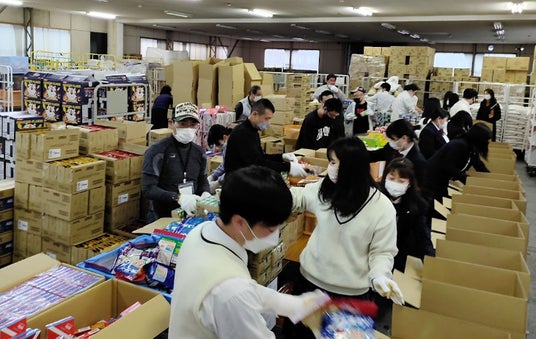 60名以上のボランティアとスタッフで寄贈品等の食品を箱詰めする様子