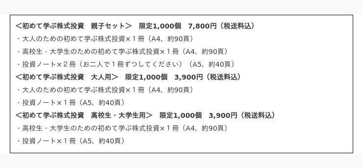 投資の基礎知識を大人向けに解説したものです。大人向けにより実践的な内容を盛り込みます。A4サイズで約90頁ほどを予定しています。