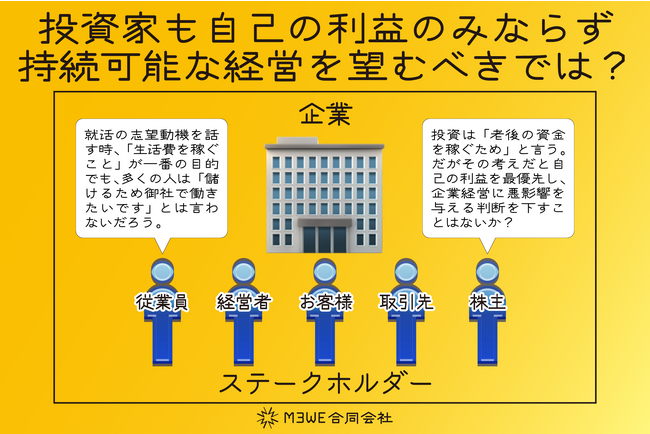 企業にとって、従業員も株主もステークホルダーです。しかし就職活動で面接を受ける際に、本当は生活費を稼ぐことが目的でも、志望動機を問われた時にそのようなことは言いません。しかし今、投資家は利益最優先で投資します。ですが従業員も株主も、会社にとっては同じステークホルダーなのです。もし株主が会社の持続可能な経営を無視し利益最優先で行動すると、会社の経営に悪影響を与えることもあります。