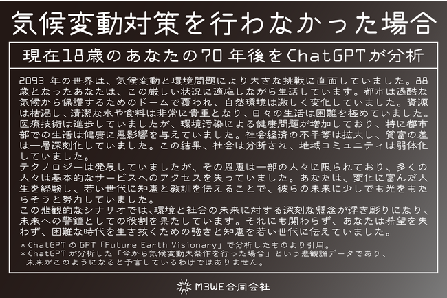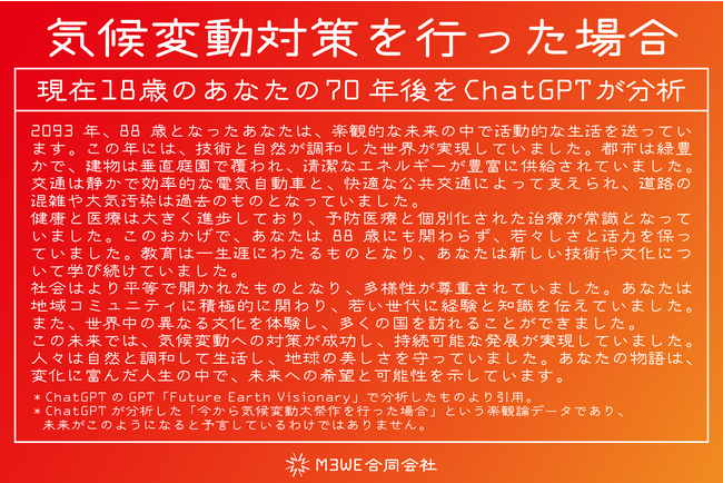 弊社では、ChatGPTのGPTsにて「 Future Earth Visionary(https://chat.openai.com/g/g-Mq6PZwwOr-future-earth-visionary)」を作成しました。このGPTでは、読者の年齢を設定し、何年後の未来を知りたいかということを書くと、それに合わせて「楽観論(気候変動対策を行った場合)」と「悲観論(気候変動対策を行わなかった場合)」を展開してくれます。以下、18歳の人が70年後の未来を見るという視点で分析したものです。上が楽観論で下が悲観論です。