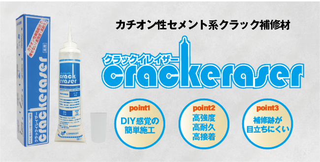 「クラックイレイザー」は、チューブに水を注ぎ、混錬してひび割れに充填するだけで、誰でも簡単にDIY感覚でコンクリートのひび割れ補修が可能です。セメント成分で構成されているので、補修後の跡も目立ちにくくなります。さらにカチオン性樹脂を配合しているので、簡易的補修材でありながら高い強度を併せ持っています。