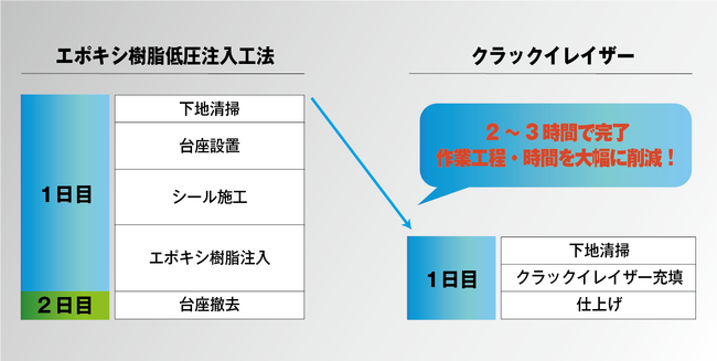 必要となる道具はスクレーパー程度で、施工者に対してほとんど負担をかけません。作業時間は2~3時間で完了し、従来のエポキシ樹脂注入と比較して大幅削減を実現しました。また、施工者もプロの職人さんである必要は有りません。一般の方でもDIY感覚でひび割れを補修することが出来ます。