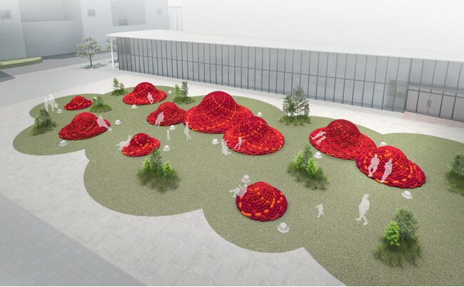 赤坂の地名や地形に関する「柔らか」「赤」「坂」の3つの要素から名づけられています。赤いクッションで編み込まれたオブジェは、昼間はくつろいだり登ったりして楽しめる遊具になり、夜は照明の灯る交流の場に。会期後には結び直してチェアへとアップサイクルされるなど、多様な価値観を「結ぶ」存在へと願ったインスタレーションです。