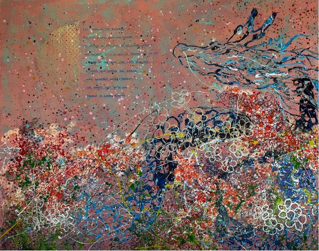 フランス出身のオードリー・フォンドゥカヴの作品は、珊瑚や植物などの自然による顔料を用いて描かれ、豊かな自然に包み込まれるような爽やかで心落ち着くひとときを鑑賞者に与えます。作曲家の阿部海太郎の演奏とともにお楽しみください。