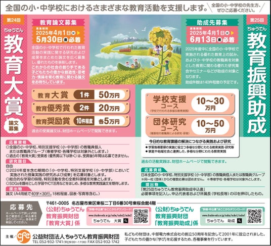 公益財団法人ちゅうでん教育振興財団(本社:名古屋市東区、代表 佐野 弘忠)は、全国の小・中学校におけるさまざまな教育活動の支援(助成・表彰)を主な事業目的とし、子どもたちの豊かな『学び』を応援する活動を行っています。2025年4月より募集を開始する「ちゅうでん教育振興助成」および「ちゅうでん教育大賞(論文)」の応募概要をご一読いただき、教育現場を活性化する手立てとしてぜひご活用ください。