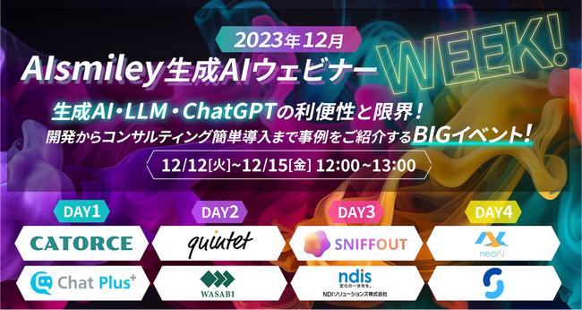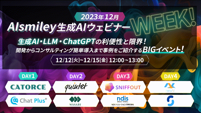 12月12日(火曜日)から12月15日(金曜日)に行われる本ウェビナーでは、生成AIが今後ビジネスへどのように転用していくか、様々な業界での生成AIの活用事例などを合計8社による登壇が行われます。