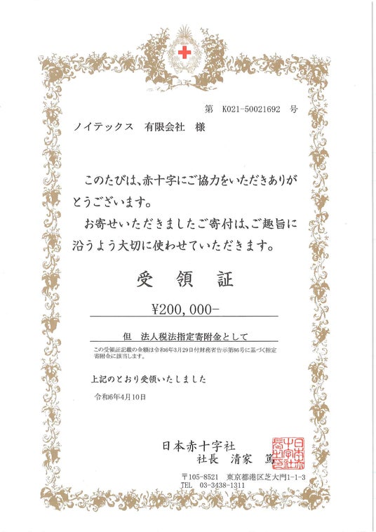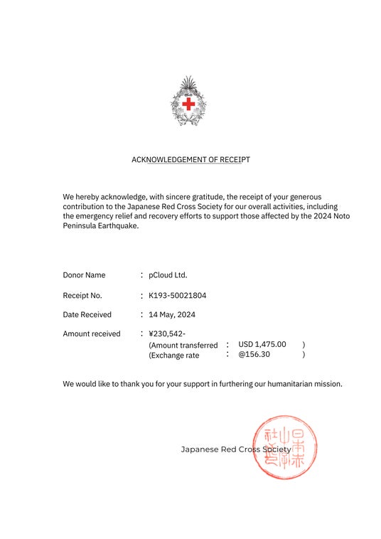 今回の寄付活動は、年始に発生した能登地震を受けてノイテックス有限会社とpCloud社で話し合い、少しでも日本への社会貢献を行いたいと考え企画しました。結果、両社で40万円相当という予想を上回る寄付金を集めることができ、日本赤十字社へは、純粋な活動費としてご利用いただくように希望を伝えた上で、お渡しさせていただいております。