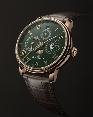 エナメルを高温で焼成する「グラン・フー」という技法を用いて彩色されたダイヤルのグリーンが、45mm のレッドゴールド製のケースに美しく調和しています。カレンダーを容易に設定できるよう、ケースにはブランパンが特許を取得した「アンダーラグコレクター」を装備。特別なツールは不要で、指先だけで調整することが可能です。他のブランパンのカレンダー機構と同様、チャイニーズカレンダーも安全設計となっており、日付が自動変更される時間帯に手動で設定や調整を行ってもカレンダー機構を損傷する恐れはありません。