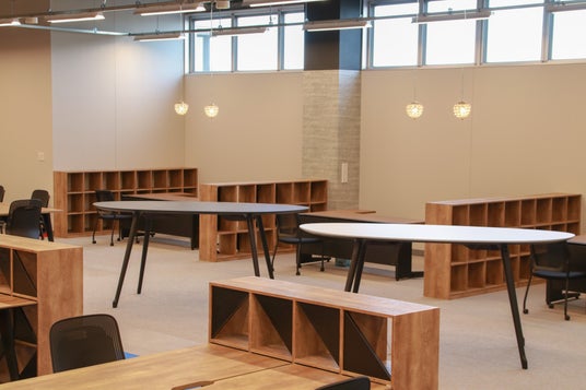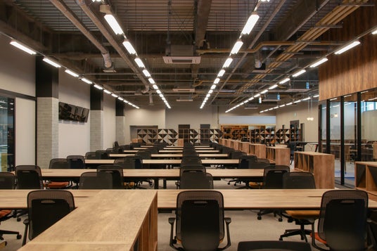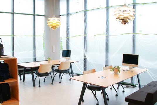 1F オフィスフロア:広々とした空間には、片側4人が余裕をもって座れるロングデスクを複数設置