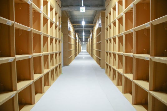 2F 倉庫フロア:商品保管にはエコも意識したダンボール製の収納ボックスを採用、無駄なくスペースを活用できるフリーロケーションで膨大なストックを管理