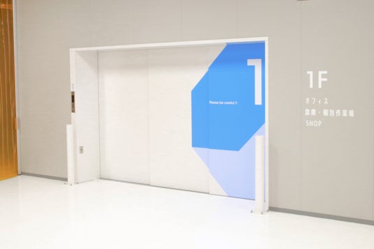 オフィス側から見た梱包・出荷業務フロア:ロゴを配したガラス扉から作業の様子をうかがうことができる