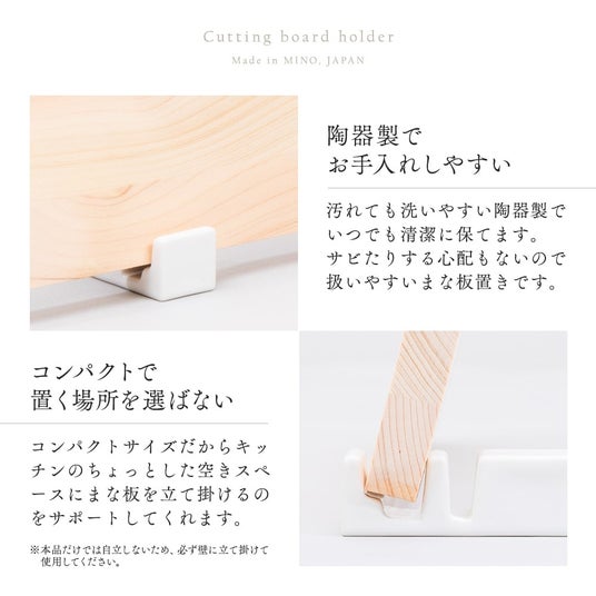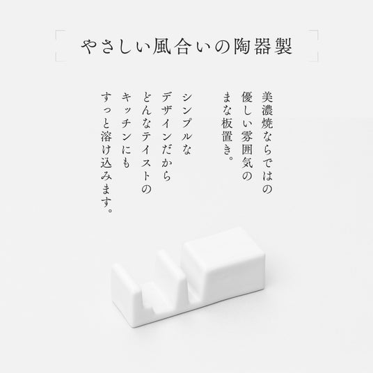 美濃焼のまな板・カッティングボード置き。やさしい風合いの陶器製で、汚れても洗いやすく清潔に保てます。※本品だけでは自立しないため、必ず壁に立て掛けて使用してください。