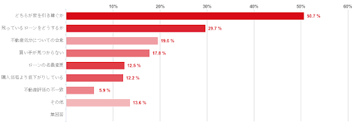 過半数の50.7%が「どちらが家を引き継ぐか」と回答し、次いで「残っているローンをどうするか」が約1/3の29.7%。「不動産処分についての合意」19.6%、「買い手が見つからない」17.8%と続きました。