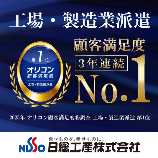 NISSOホールディングスの子会社である日総工産株式会社(以下、当社)は、株式会社oricon MEが行った2025年 オリコン顧客満足度(R)調査「工場・製造業派遣」において総合第1位を受賞いたしました。これにより2023年・2024年に続いて3年連続での総合第1位となります。