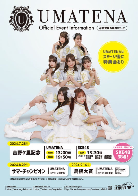 7月28日(日)に開催される「吉野ヶ里記念」では、UMATENAのステージイベントに加え、特別ゲストとしてSKE48の来場が決定! 8月29日(木)は佐賀競馬二大ダートグレード競走のひとつでもある「サマーチャンピオン」を開催。JRA馬も含む全国の強豪勢と九州勢の熱戦をお楽しみいただけます。イベントが盛りだくさんの夏の佐賀競馬に、ぜひお越しください!