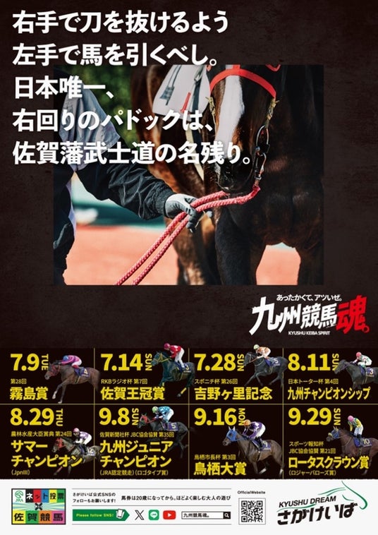 「あったかくて、アツいぜ。九州競馬魂。」を年間スローガンに、プロモーションを展開している佐賀競馬(佐賀県競馬組合)。2024年は、“ダート競馬の祭典”JBCが佐賀競馬で初めて開催される特別な年。全国から注目が集まる今、佐賀競馬の顔でもある騎手の魅力について、より深く知っていただくために、細かすぎる騎手紹介PV『さがけいば 魂の騎手たち』を制作しました。本日よりさがけいば公式YouTubeチャンネルで公開します。