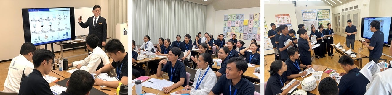 本アカデミーでは、日本語や日本の生活様式を学ぶだけでなく、施設内に設けたホテルの客室を想定したモックアップルームでの客室清掃のほか、飲食サービスの業務など宿泊施設での就業に必要なレストラン研修などを座学で学ぶことが可能です。ホテル業のそれぞれの分野を極めたプロフェッショナルな講師陣からホテルにまつわるさまざまな技術指導が受けられるのが特徴です。