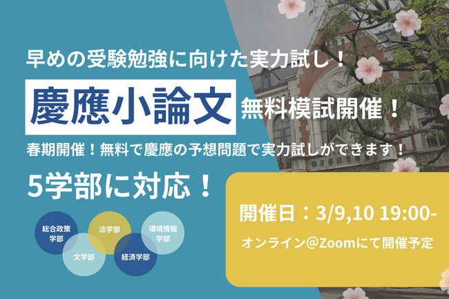 限定開催で慶應義塾大学学部別小論文模試を開催します!受験に向けて対策する前に今の実力を測ってみませんか?講師陣が、綿密に作成した採点基準と予想問題で点数と苦手な項目を教えてくれます!