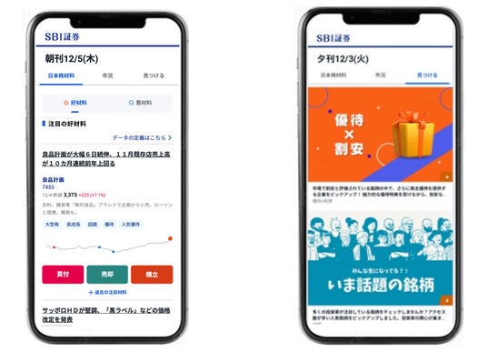 「日本株材料」タブでは、個別株式に関する膨大なニュースを生成AIが分析し、その日の注目の好材料・悪材料銘柄として紹介します。「市況」タブでは、生成AIが記事を要約し、「朝刊」のタイミング(日本営業日の8時20分ごろ)で国内のマーケットの見通し・米国マーケットの振り返り、「夕刊」のタイミング(日本営業日の18時15分ごろ)で国内マーケットの振り返りのニュースを提供します。そして「見つける」タブでは、初心者の方でも、いま話題の銘柄や高成長銘柄等、気になるテーマに該当する銘柄を簡単に見つけることができる特集コンテンツを提供します。