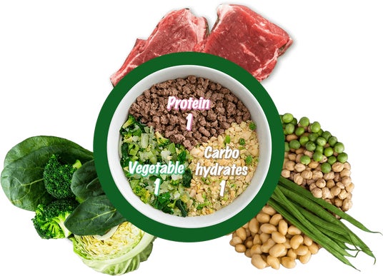 タンパク質、野菜、炭水化物を1:1:1の割合で混ぜるフレッシュドッグフード