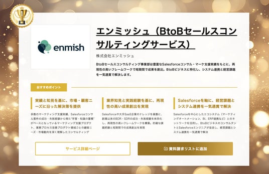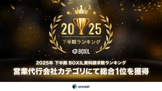 株式会社エンミッシュ(本社:東京都渋谷区、代表取締役社長:河原 義平)は、スマートキャンプ株式会社が運営するSaaS比較サイト「BOXIL」において発表された「2025年下半期 BOXIL資料請求数ランキング」の営業代行会社カテゴリにて、総合部門・大企業部門・中小企業部門の3部門すべてで1位を獲得したことをお知らせいたします。