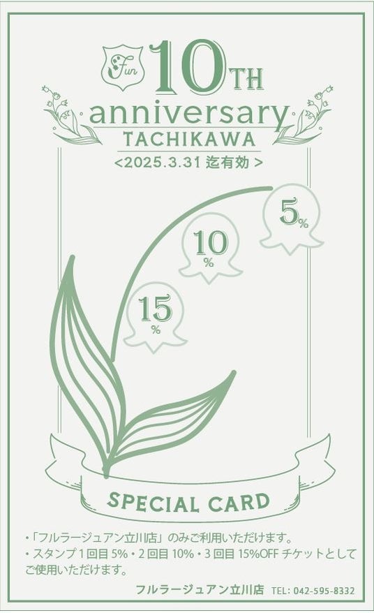 SNSフォローでもらえる!お買い上げごとにお得になるお花スタンプカードフルラージュアン立川店とLINEのお友達登録をしてくださった方、またはフルラージュアンのインスタグラムをフォローしてくださった方全員に、次回以降お買い上げごとにスタンプを貯めて、5%→10%→15%とどんどんお得になるカードをプレゼントいたします。