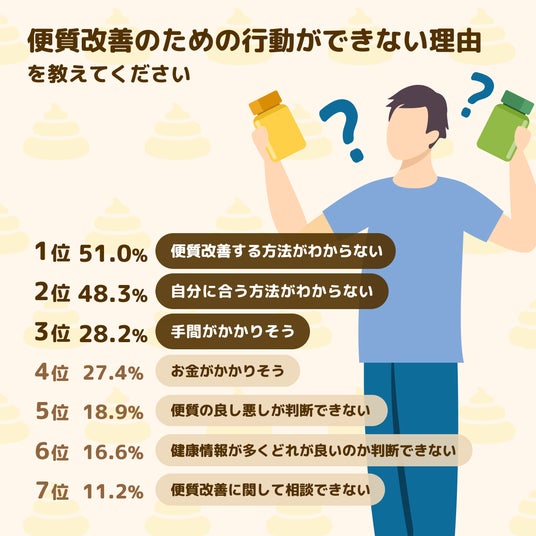 ・便質改善のために行動をしている人を対象に、便質改善をする上で困っていることを聞いた設問では、「やり方が分からない」という回答が最も多く、次いで「自分に合うかどうかがわからない」などの回答が多かった。