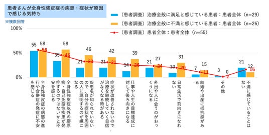 患者さんに全身性強皮症の疾患・症状が原因で感じる気持ちについて質問したところ(複数回答可)、「病態の進行や合併症の発症に不安を感じる」と回答した人が56%で、「全身性強皮症以外の膠原病・自己免疫性疾患が発症するのではないかと不安を感じる」46%、「疾患名が知られていないので、自分の症状を周囲の人に説明するのが嫌になる」33%と続きました。