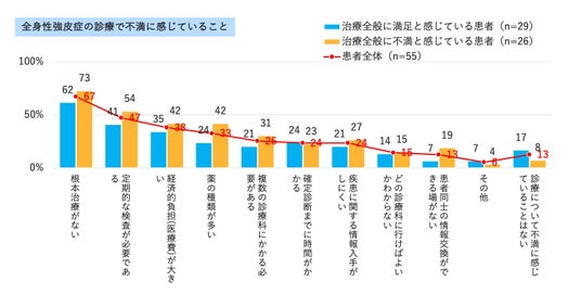 全身性強皮症はその多様な症状により、患者さんが早期に受診し、確定診断に至ることが難しい疾患です。根本的な治療が存在せず、十分な効果を感じられないまま検査や通院を継続せざるを得ないこと、疾患の認知不足による精神的ストレスが不満として多く挙げられました。