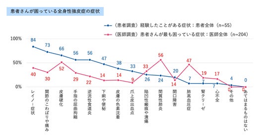 一方、全身性強皮症を診療する医師(n=204)に、患者さんが最も困っている症状をたずねたところ、「間質性肺炎」が56%と最も多く、次いで「皮膚硬化」52%、「肺高血圧症」47%、「レイノー現象」40%が挙げられました。