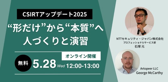 NTTセキュリティ・ジャパン株式会社(本社:東京都、代表取締役社長:関根 太郎、以下 NTTセキュリティ・ジャパン)は、2025年5月28日(水)に合同会社アートピア(本社:東京都、代表取締役:堀居 隆生、以下アートピア)と、「CSIRTアップデート2025~“形だけ”から“本質”へ 人づくりと演習」セミナーを共同開催します。