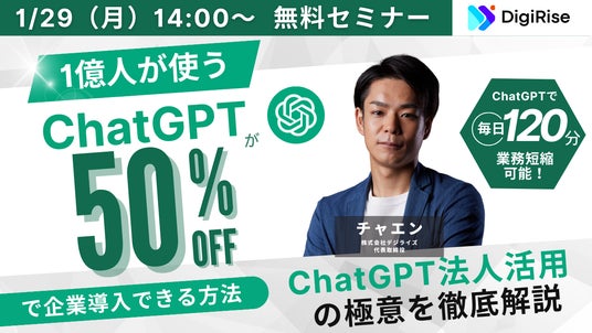 「AIの利便性と感動を全ての人に届ける」をビジョンに掲げる、株式会社デジライズ(東京都目黒区、代表取締役:茶圓 将裕)が「ChatGPT Teamプランを半額で導入する方法と法人活用の極意を徹底解説セミナー」を1月29日(月)14:00より開催することをお知らせします。