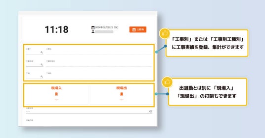 出退勤と併せて「現場入」「現場出」の打刻を行う事で、工事別・工種別に従事時間の登録が可能です。各工事現場の労働時間や作業内容を簡単に把握することができます。