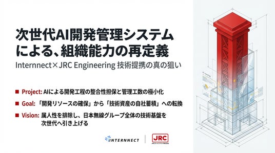 JRCエンジニアリング株式会社(本社:東京都三鷹市、代表取締役社長:岡村 俊幸、以下「JRCE」)と、株式会社Internnect(本社:千葉県市原市、代表取締役:岡本 龍一、以下「Internnect」)は、AIを活用した開発管理基盤の共同構築に向けた技術提携を開始したことをお知らせいたします。