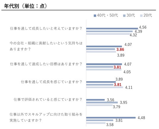 全年代・全役職で成長意欲は非常に高い。一方、30代/中間管理職に差し掛かると、達成したい目標・成長実感・仕事への評価のスコアが低下