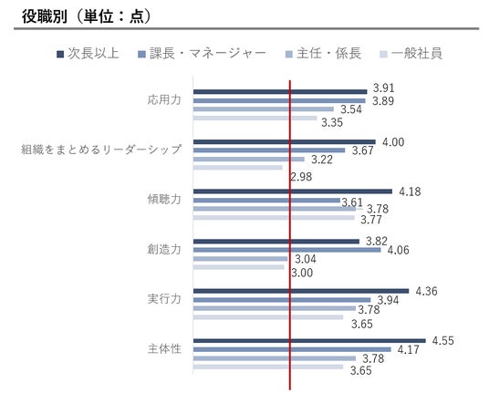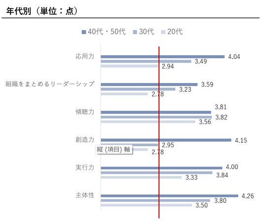 - ビジネス基礎力(スキル編)20~30代において「創造力」のスコアが低い