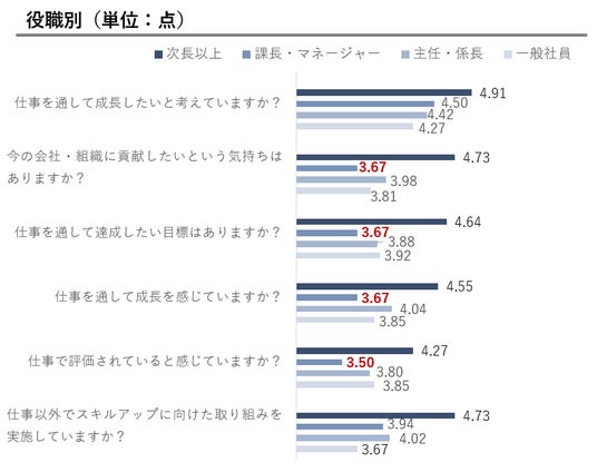 また、中間管理職(課長・マネージャー)クラスについては、組織貢献欲や成長実感、自己肯定感が低下。上司と部下の狭間で苦慮する姿が明らかになりました。