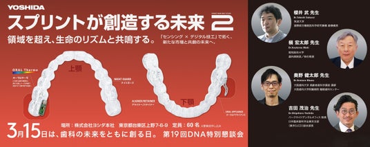 第20回への布石として開催される第19回DNA特別懇談会では、「体内時計」と「サーカディアンリズム(概日リズム)」をテーマに設定しています。 口腔内から得られる連続的な生体データを可視化するウェアラブルセンサー「オーラルサーモ(連続測定電子体温計)」の活用や、最新の3Dプリンター「SprintRay Pro2」を用いた革新的な製作プロセスなど、テクノロジーと臨床が融合する新しい歯科医療の姿を提案します。