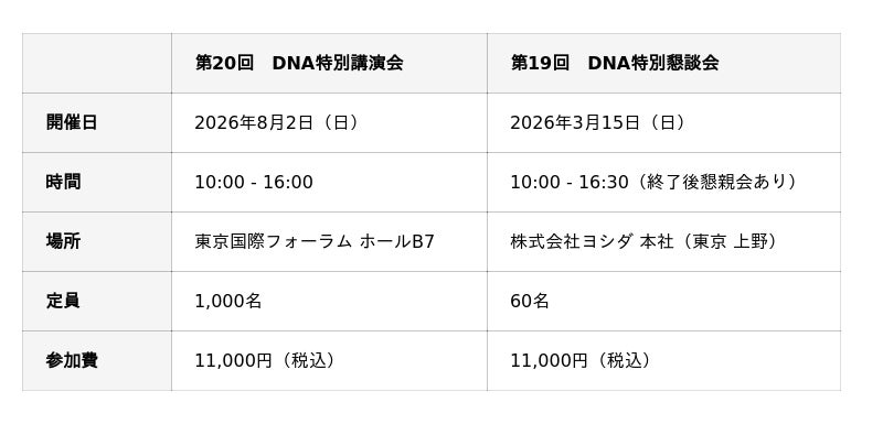歯科医療機械の総合商社である株式会社ヨシダ(本社:東京都台東区、代表取締役社長:山中一剛)は、2026年に創業120周年を迎えることを記念し、同年8月2日(日)東京国際フォーラムにて第20回「DNA(Dental Next Action)特別講演会」を開催いたします。