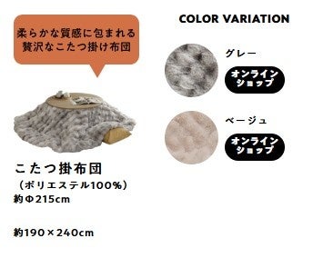 【 対応こたつ台サイズ早見表 】 ・コタツ布団:215cm丸サイズ―コタツ天板:75~105cm丸対応・コタツ布団:190x240cmサイズ―コタツ天板:W105~120cm角対応