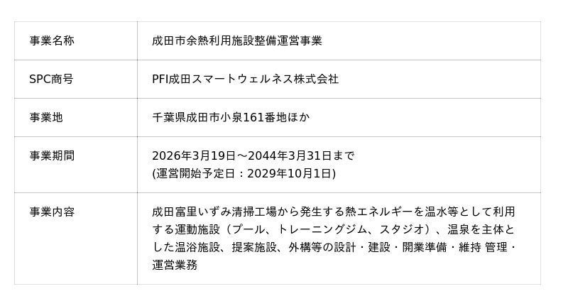 総合建設業の株式会社イチケン(本社:東京都港区港南、代表取締役社長:政清 弘晃)は、この度、成田市が推進する「余熱利用施設整備運営事業」において、当社が属するグループが落札者に選定されたことをお知らせいたします。これに伴い、本事業を受託する特別目的会社(SPC)を設立し、出資を行います。