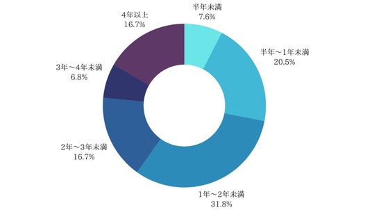 「1年~2年未満」が最も多い結果となった。また、全体の半数以上を2年未満の割合が占めており、近年対策を始めた企業が多いことがわかる。反対に、「4年以上」の割合は16%と一定数の企業は長期間で対策しているといえるだろう。