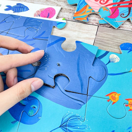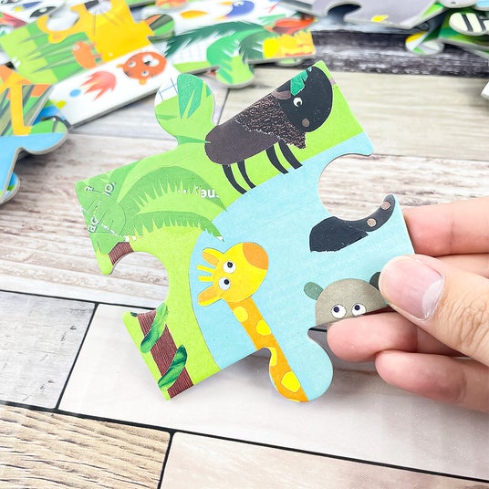 まずはジグソーパズルとしてパズルを完成させます。パズルを完成させたら、枠に描かれている絵をパズルの中から探します。『パズル』と『絵探し』の2段階の遊び方ができます。