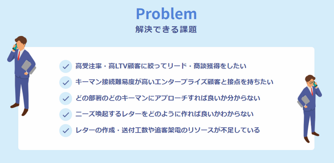 セールスレターの送付後、各企業へ後追い電話アプローチを実施することで、商談獲得率に貢献します。