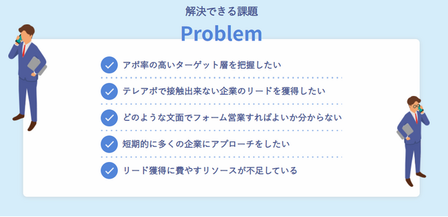 リストご提供いただき送信することはもちろん、貴社の商材を理解した上でアポ獲得の可能性が高い業界の分析、リスト作成、フォーム送信後の追客まで対応可能です。
