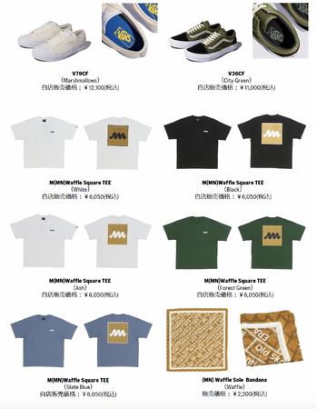 また、数多くのコレクターが存在するMIN-NANOのバンダナコレクションから、VANSの象徴でもあるワッフルソールのカラーがベースとなったバンダナや、バックプリントのMIN-NANOの手描きロゴがインパクトのあるTシャツをリリースし、MIN-NANOとVANSだからこそ実現したラインアップになっております。