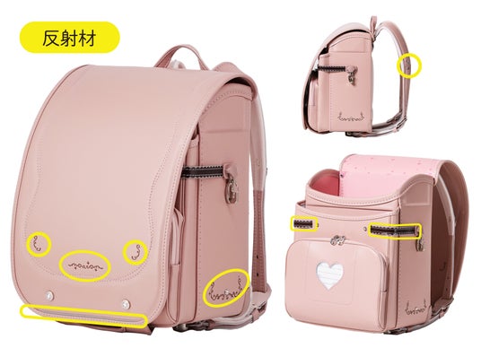 箔押しエンボス模様とマチベルトは反射材で構成し、360°全方向からの視認性を高める役割を持たせています。可愛いだけでなく機能性も兼ね備えたランドセルです。