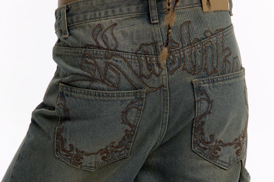 男性も着用可能なバックポケットの刺繍ロゴパンツがシグネチャーの人気アイテム。